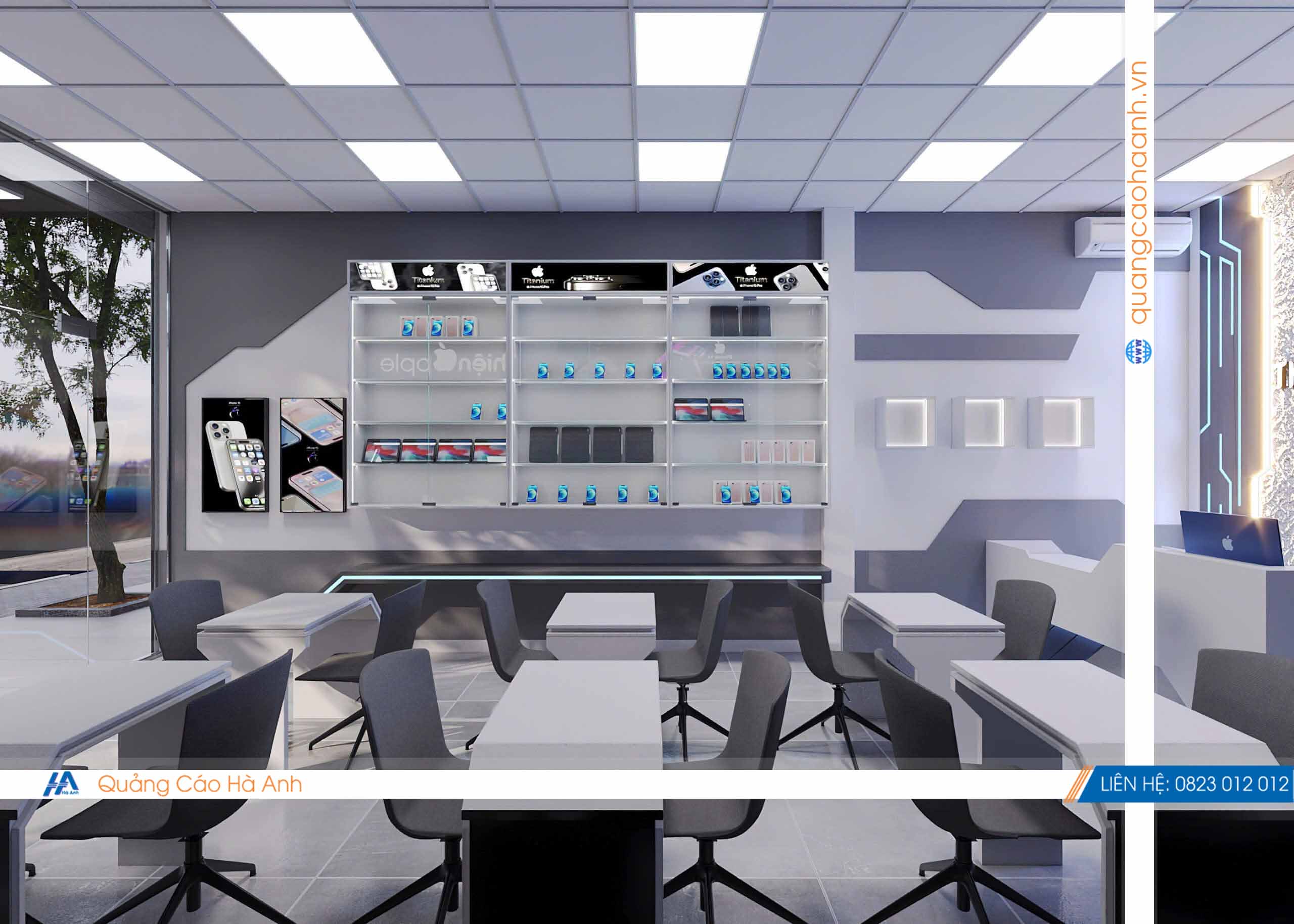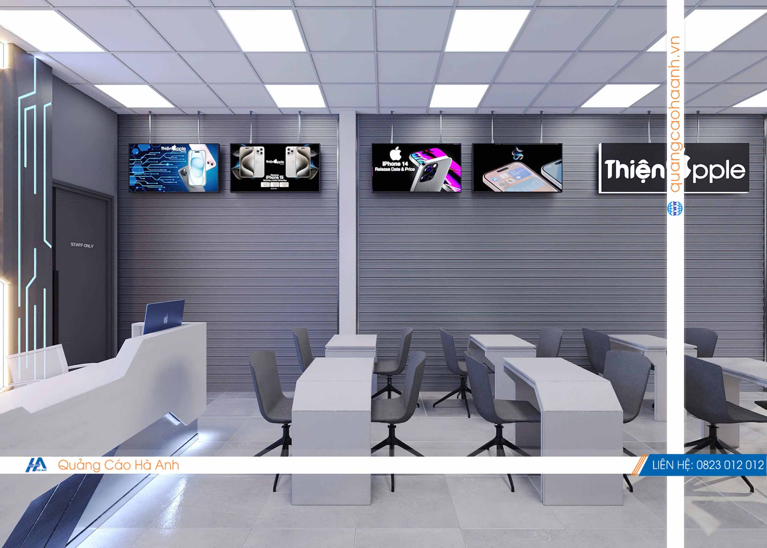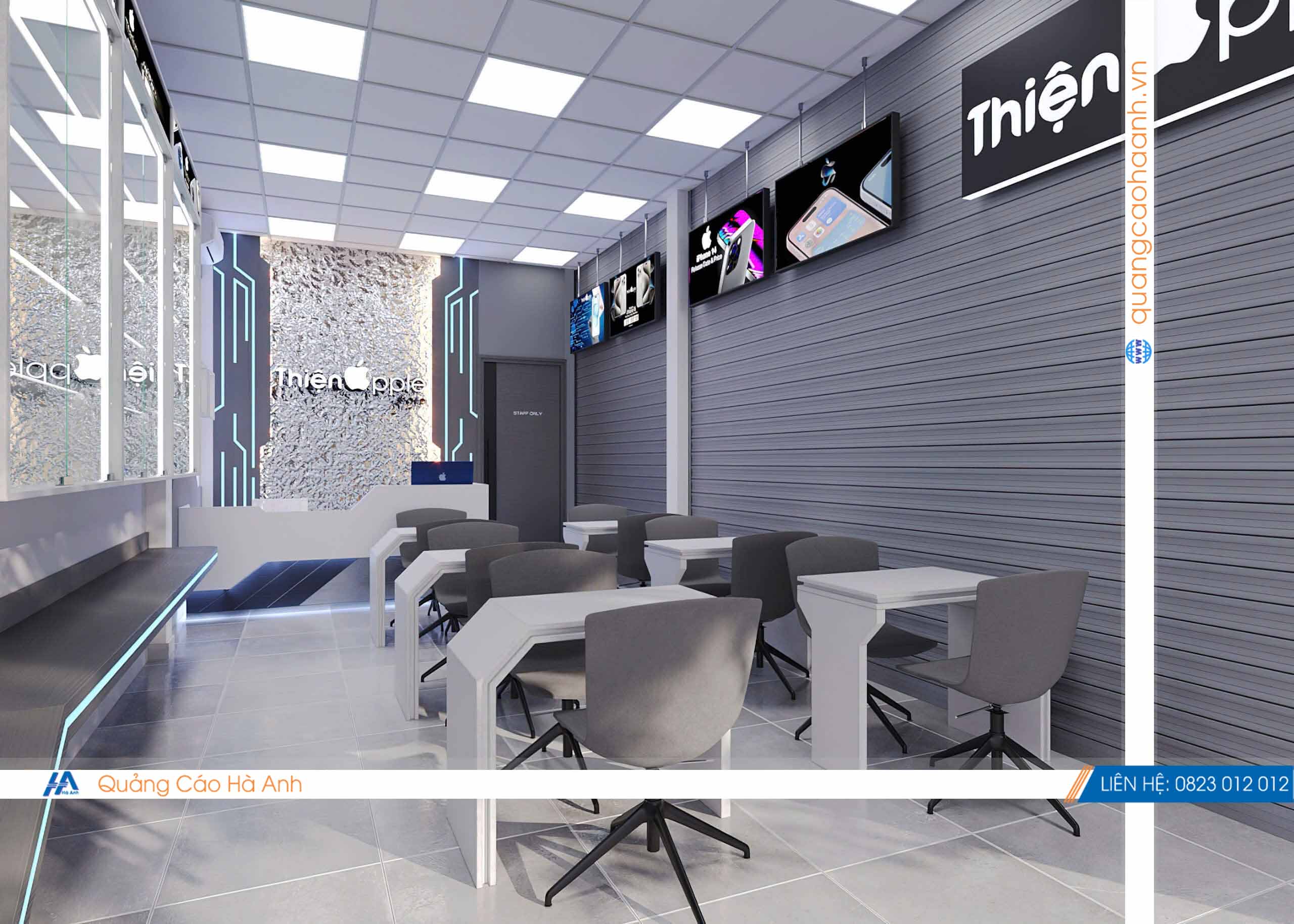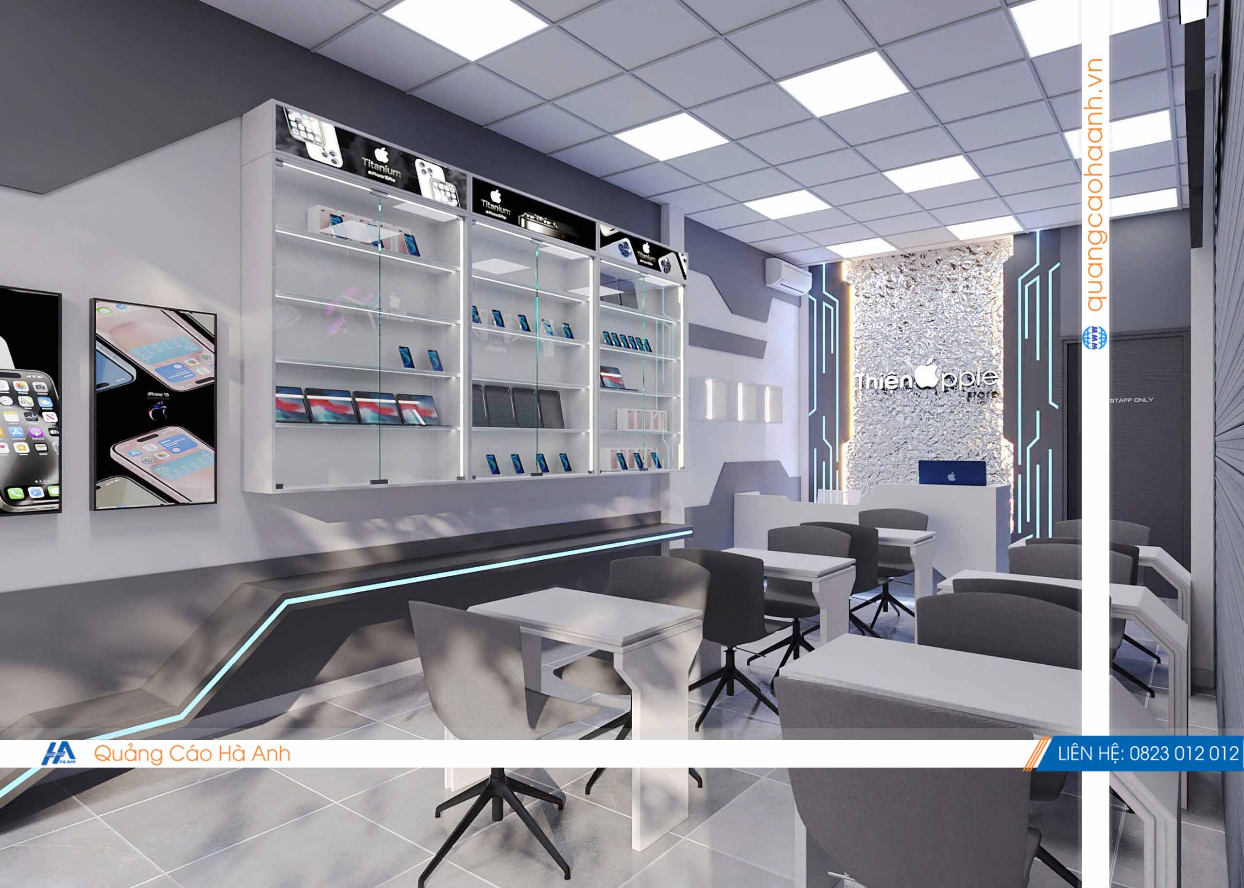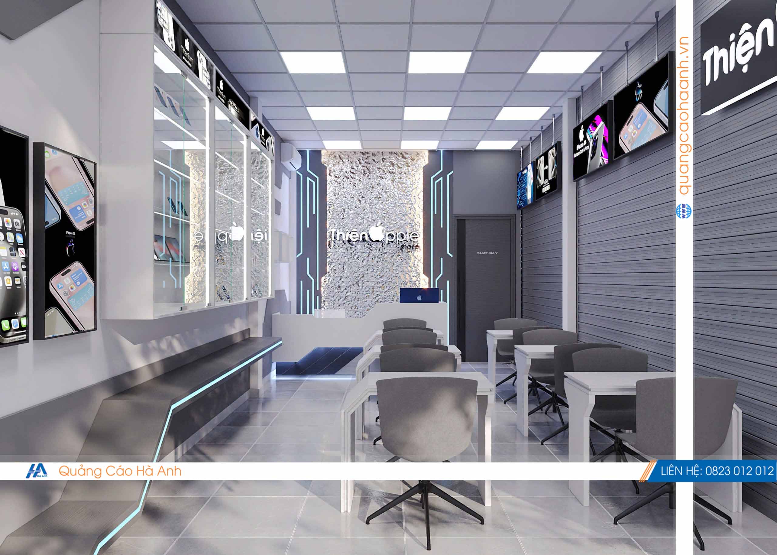 Thiết kế cửa hàng điện thoại Thiện Apple bởi Quảng cáoHà Anh là đơn vị chuyên thiết kế & thi công nội thất bảng hiệu các công trình Shop, Showroom, Spa, Nhà hàng, karaoke, Cafe... hàng đầu.