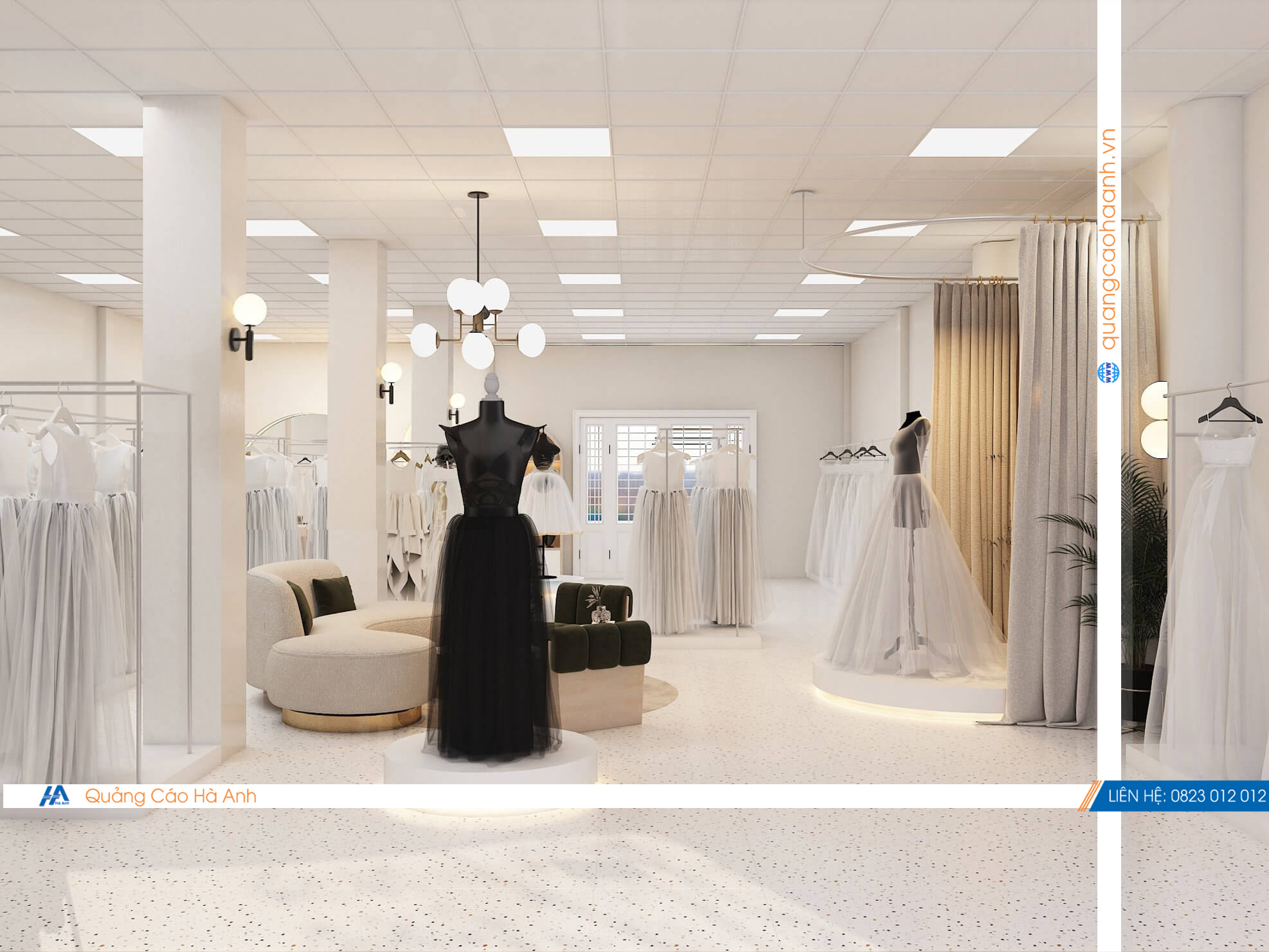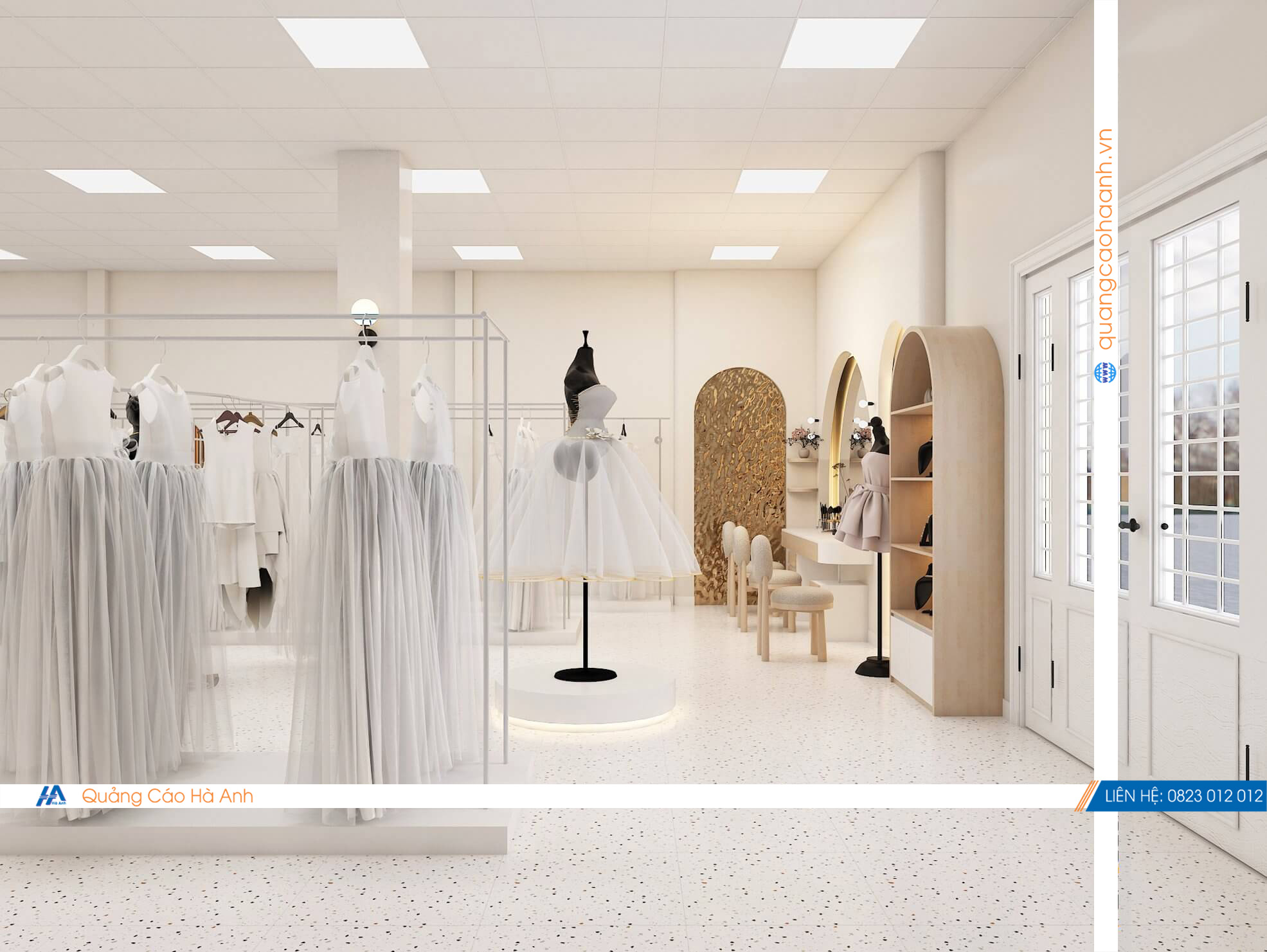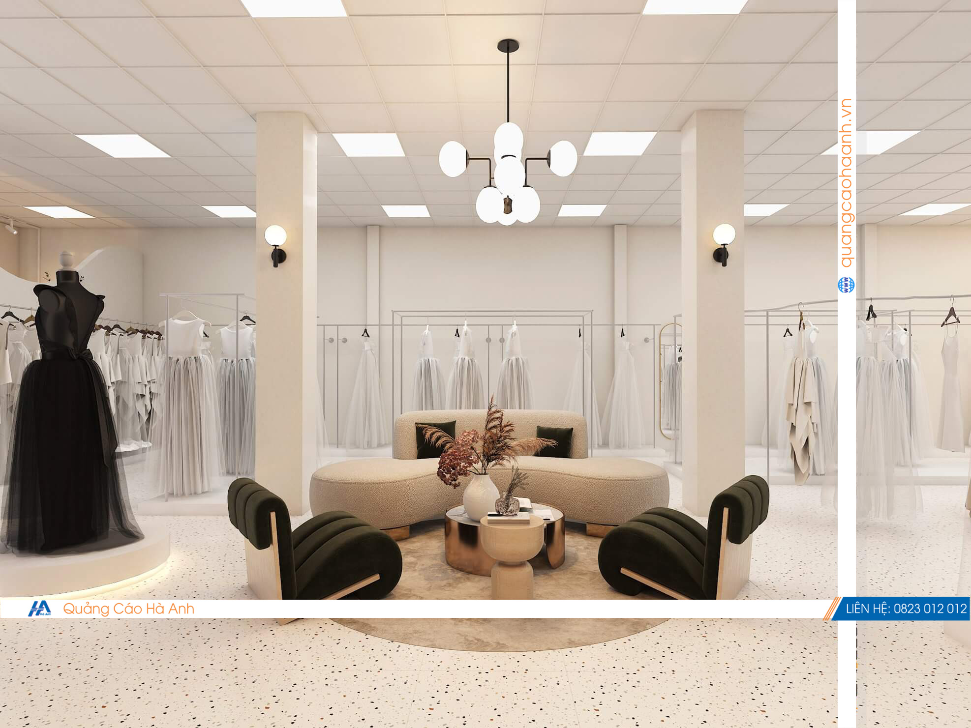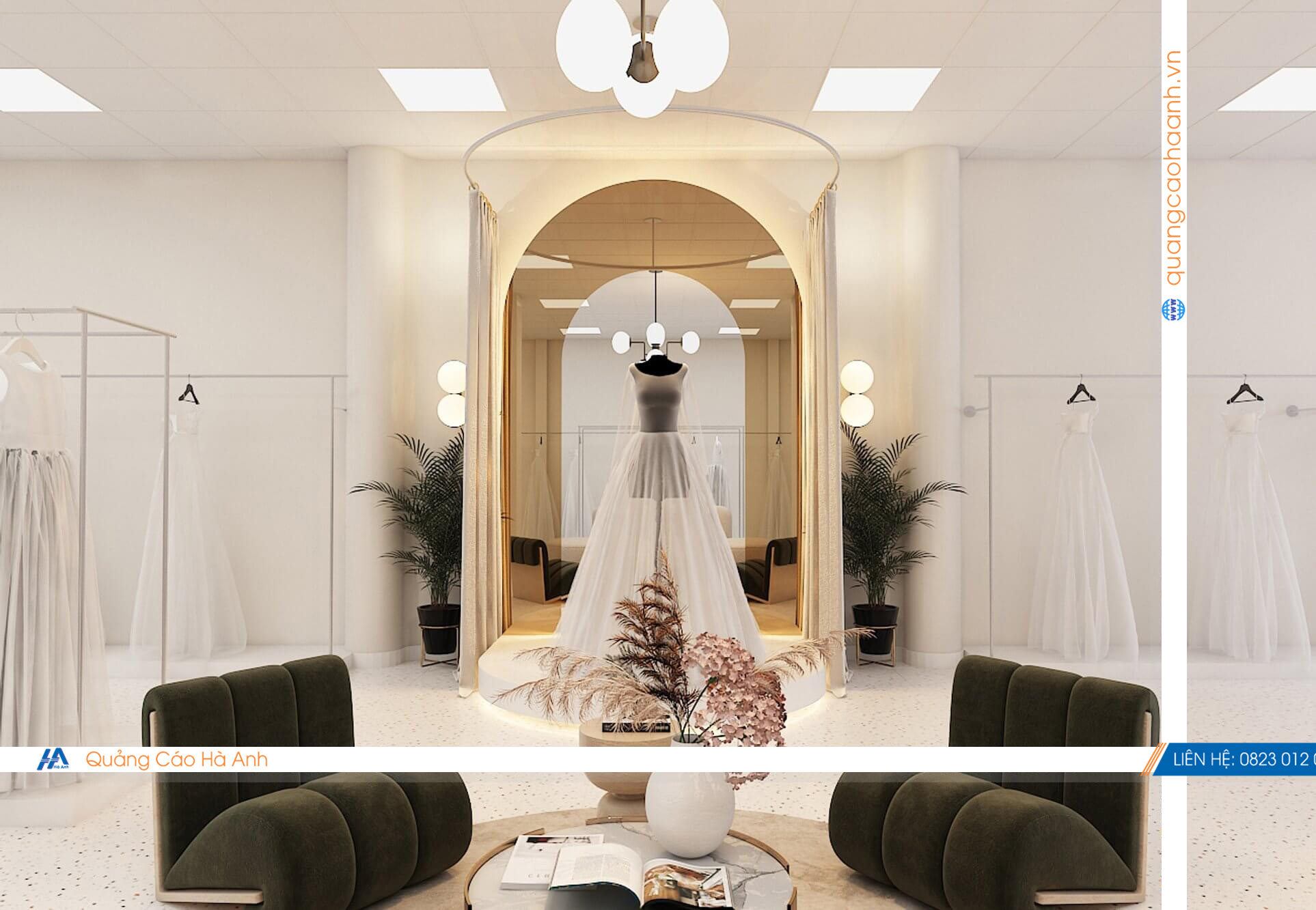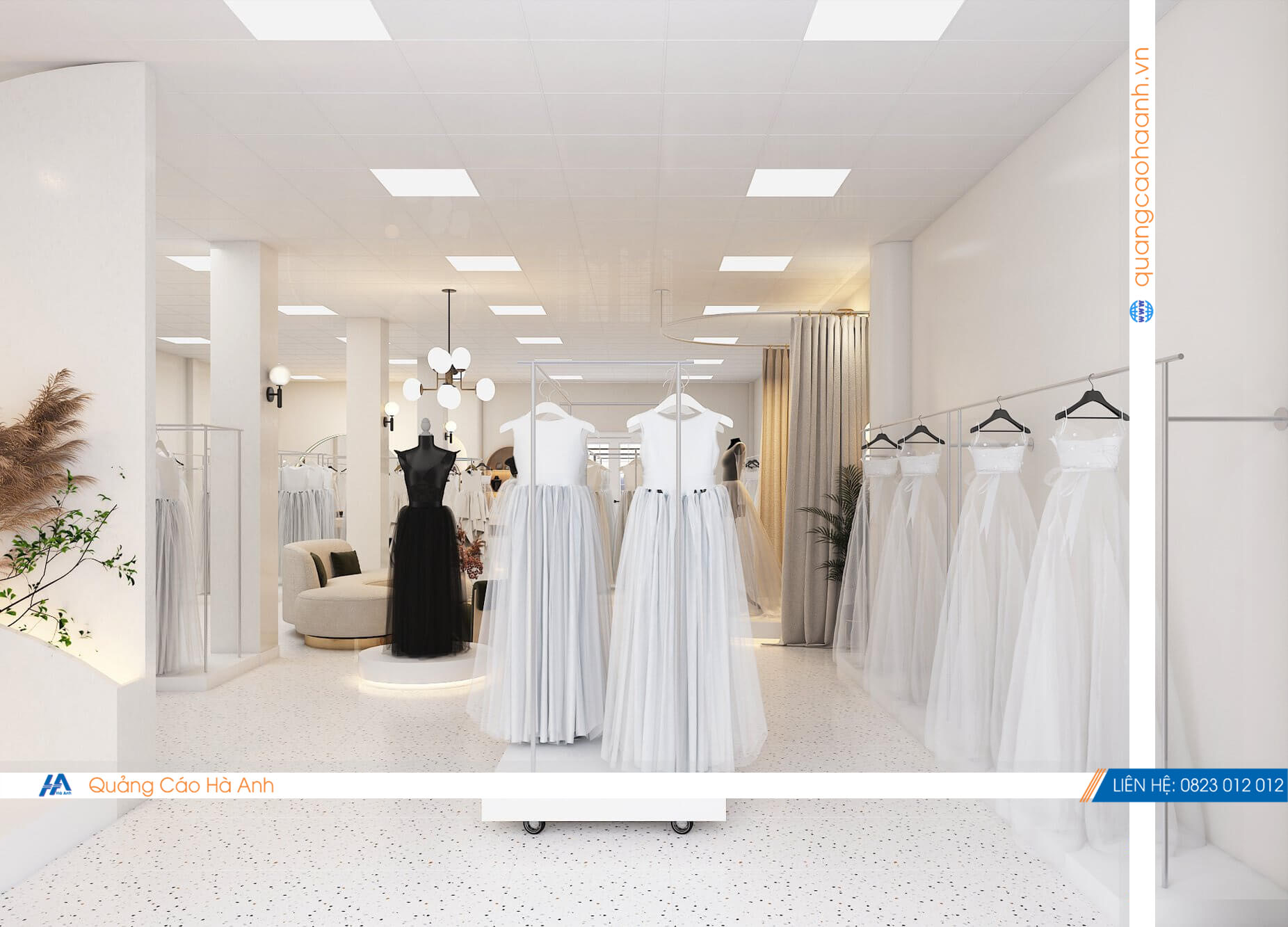 Thiết kế shop váy cưới Nguyễn Studio bởi Hà Anh là đơn vị chuyên thiết kế & thi công nội thất bảng hiệu các công trình Shop, Showroom, Spa, văn phòng, Nhà hàng, karaoke Cafe... hàng đầu.