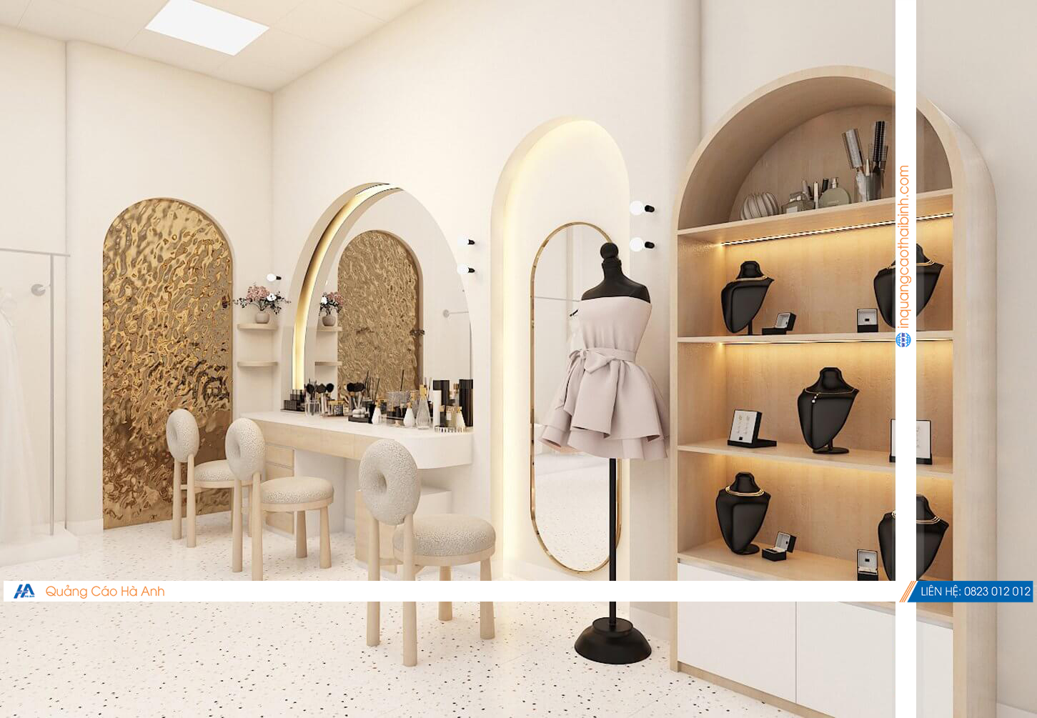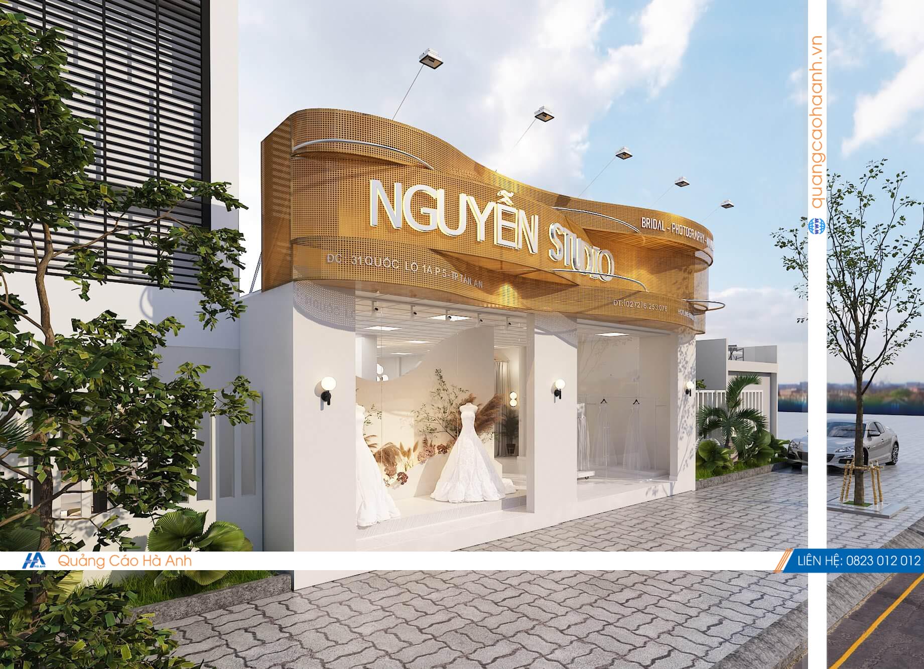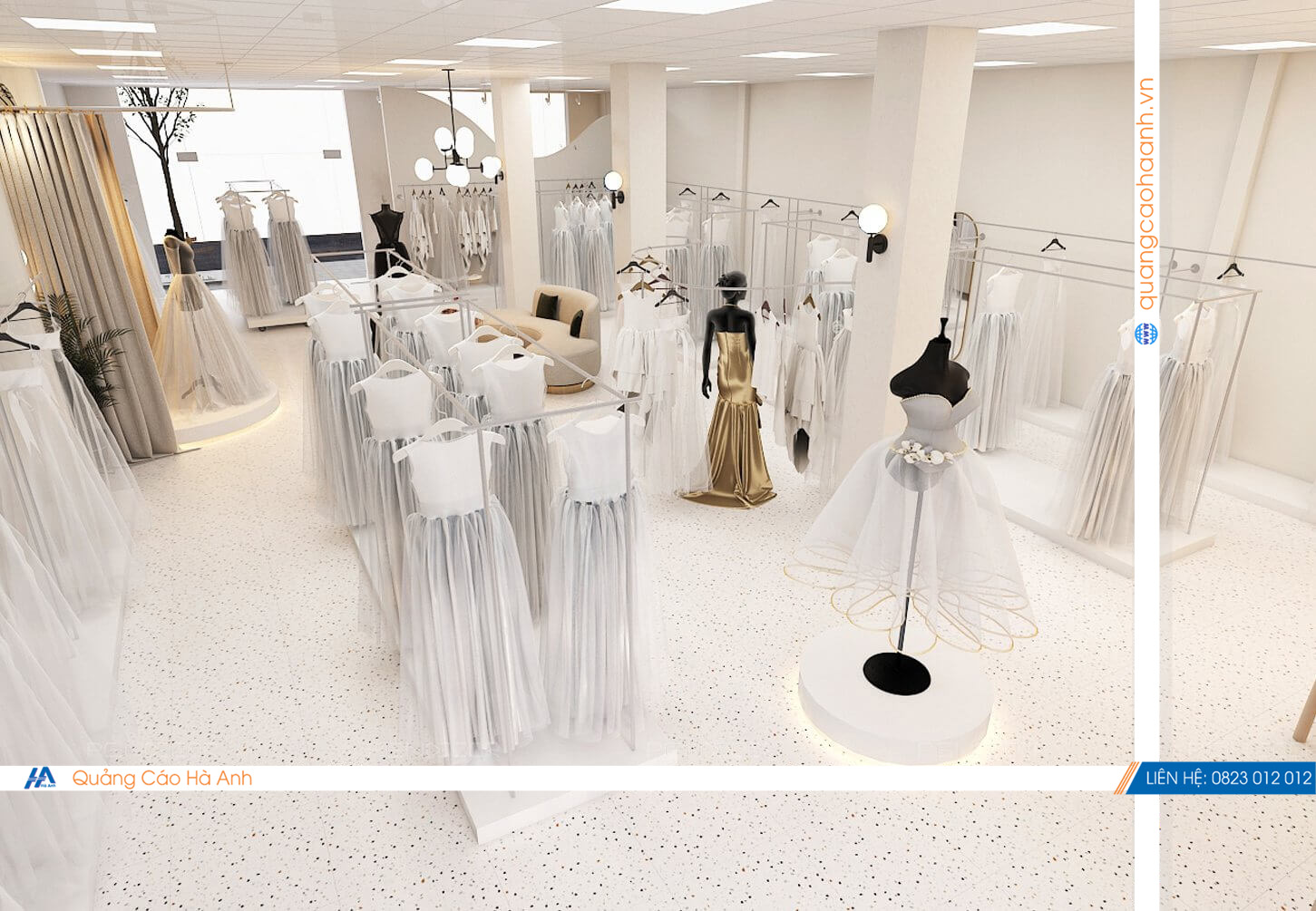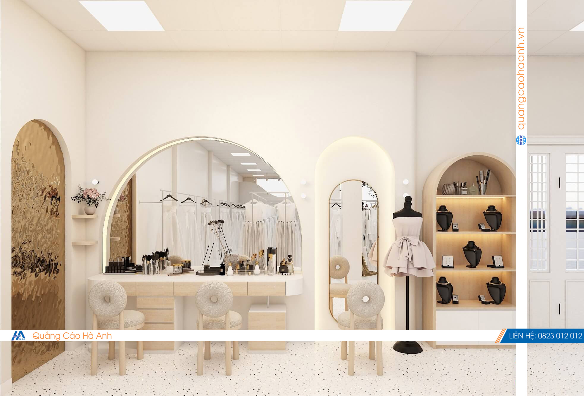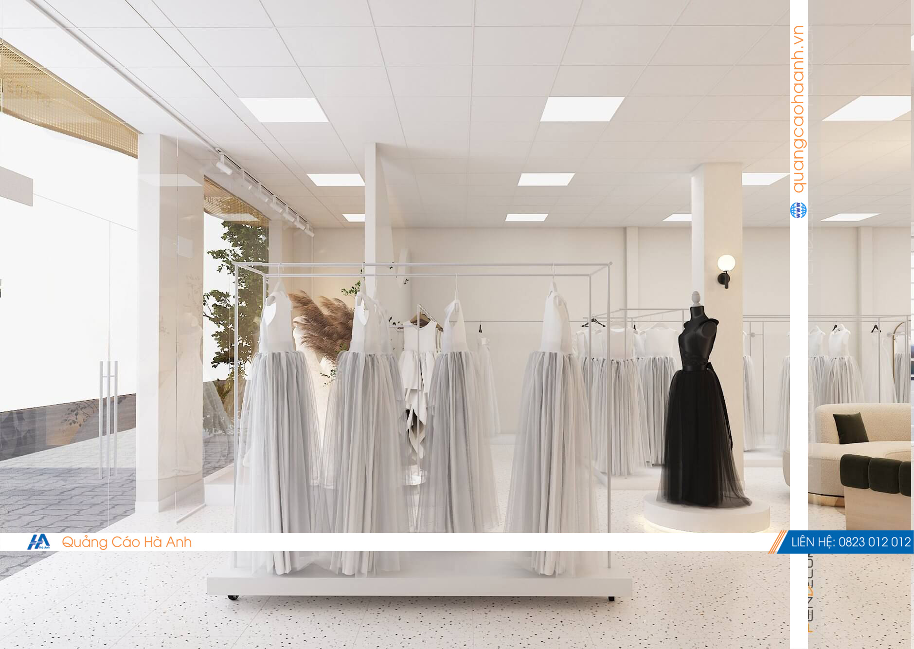 Thiết kế shop váy cưới Nguyễn Studio bởi Hà Anh là đơn vị chuyên thiết kế & thi công nội thất bảng hiệu các công trình Shop, Showroom, Spa, văn phòng, Nhà hàng, karaoke Cafe... hàng đầu.