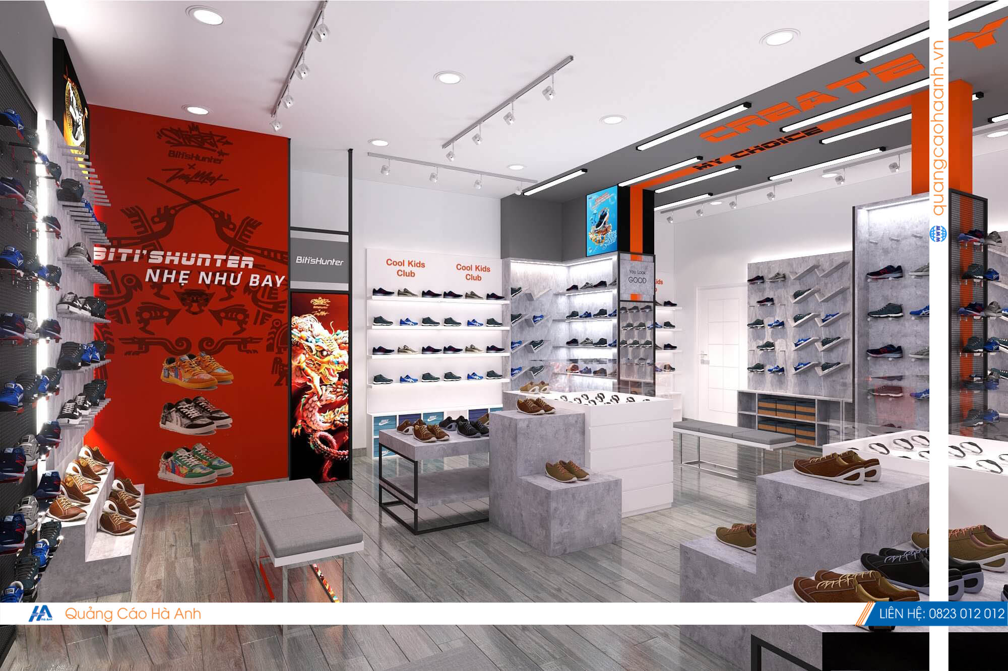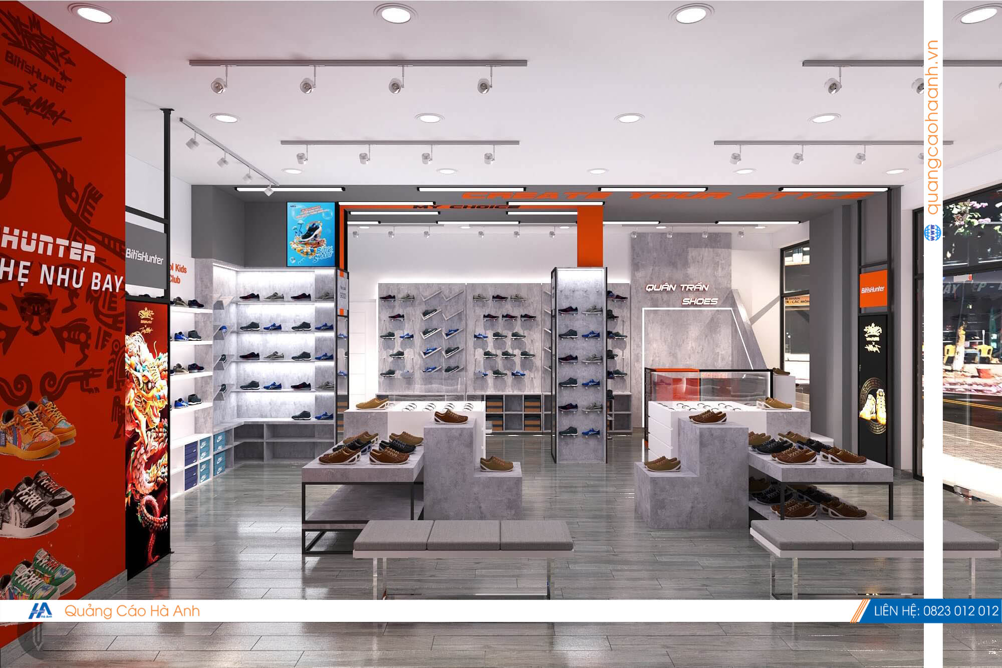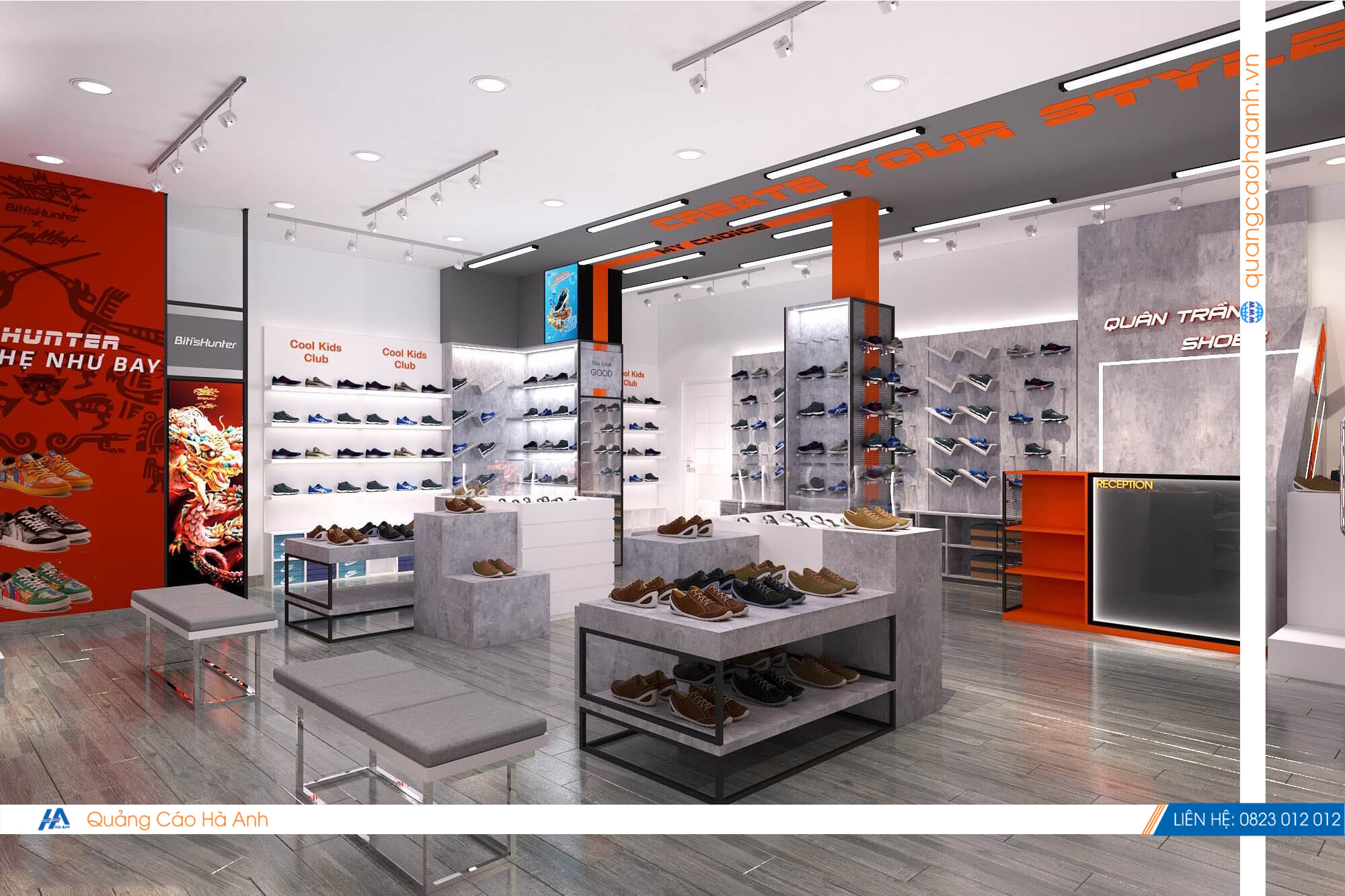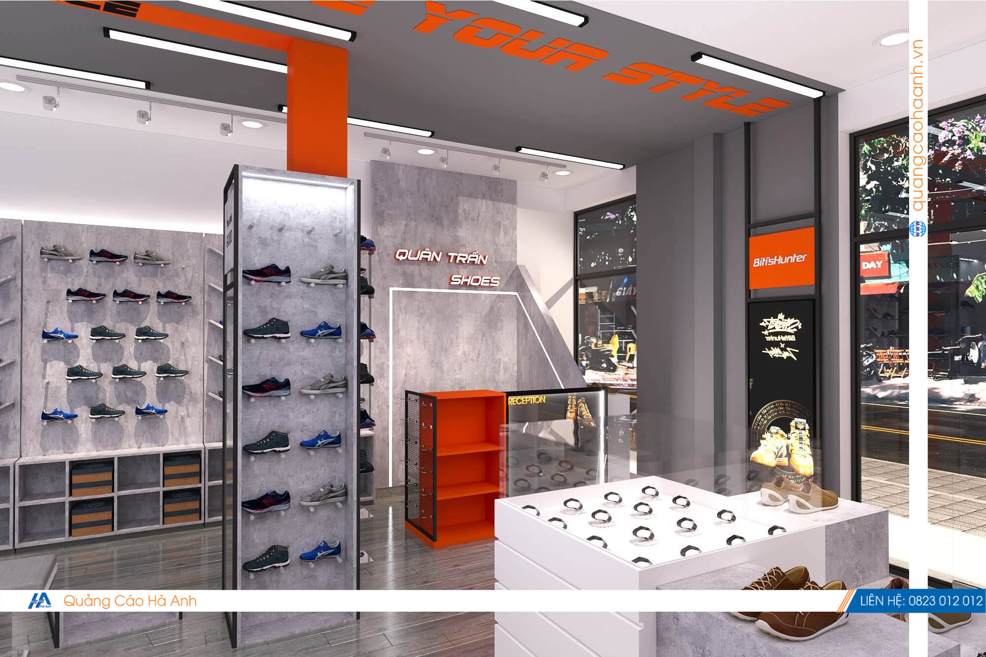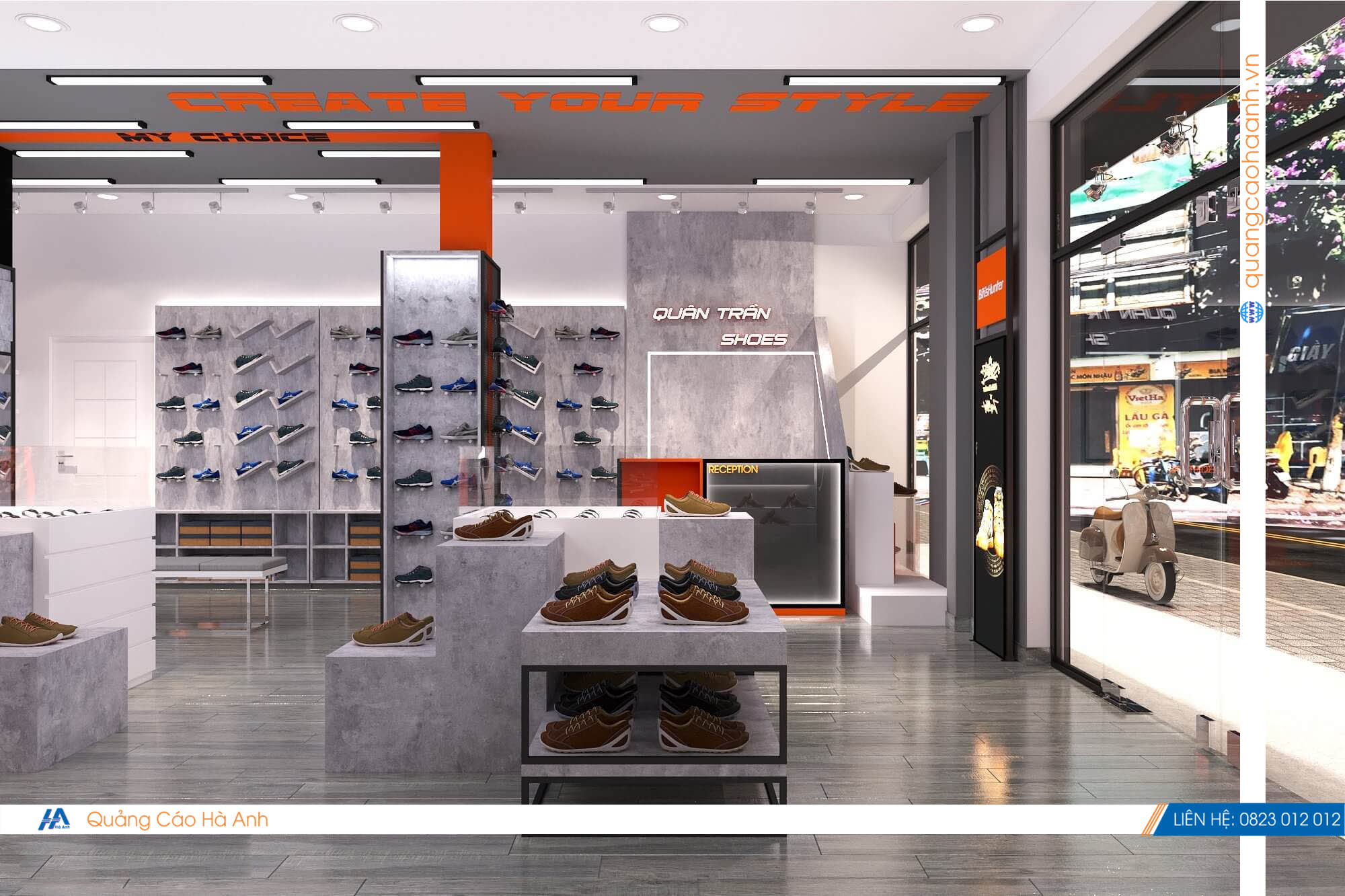 Thiết kế Shop giầy Quân Trần Shoes bởi Hà Anh là đơn vị chuyên thiết kế & thi công nội thất bảng hiệu các công trình Shop, Showroom, Spa, văn phòng, Nhà hàng, karaoke Cafe... hàng đầu.