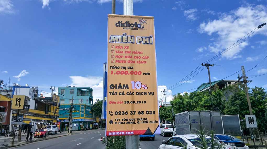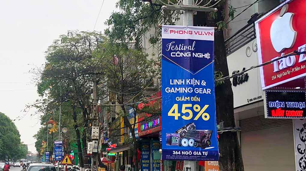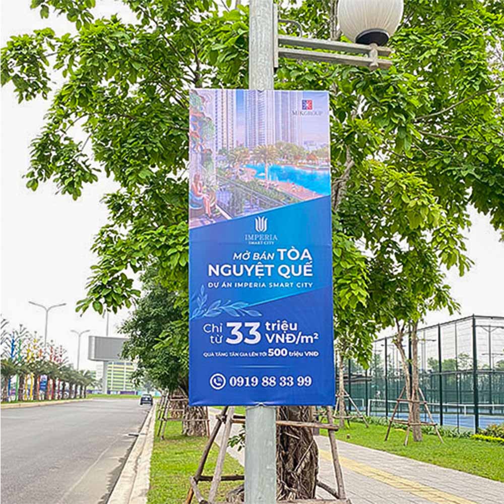 In phướn quảng cáo hay còn gọi là in cờ phướn quảng cáo chính là một dạng treo băng rôn quảng cáo ngoài trời. Nội dung treo phướn quảng cáo sẽ được in trên cờ có dạng hình chữ nhật và được treo theo chiều dọc. Treo phướn trên các cột đèn, thân cây, giá đỡ,…